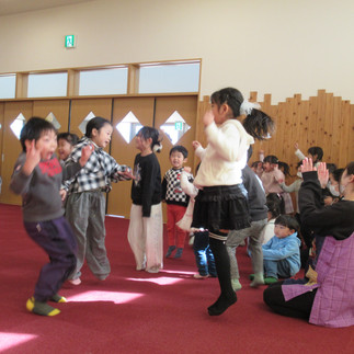 2月生まれのお友達は、何と2人! お話することが難しい小さなクラスのお友達だったので、担任の先生に協力してもらいながらインタビューしました(*^-^*) お歌のプレゼントの後は、「○△□マジックシアター」!形が描かれたカードから、白い紙を引き出すと色付きの絵に変身する仕掛のシアターに、みんな沢山答えを出してくれたのでとても盛り上がりました♪ 大きなクラスのお友達がやったクラス対抗大玉転がしでは、まっすぐ転がせ